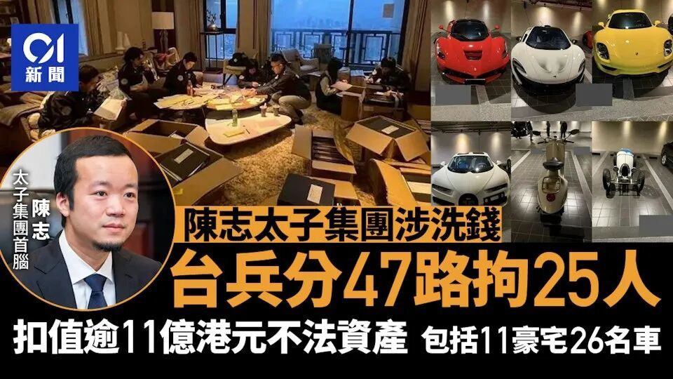 继美国联邦检察官10月8日起诉太子集团首脑陈志等人、美国财政部海外资产控制办公室(OFAC)10月14日公告制裁后,台北地检署今日(4日)指挥检警调兵分47路搜索台北101大楼内的天旭公司等5家太子集团在台据点,拘提25名被告到案,并扣押总值45.27亿元新台币的豪宅、超跑与银行账户等。全案将朝洗钱、赌博、组织犯罪等方向侦办。